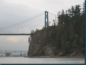 After cinnamon sticky buns, lattes and a lazy morning, Steve returned us to the boat where we did a quick check to make sure that all was well and hopped on a bus to West Van to share Thanksgiving dinner with the Mulanians. The bus driver was completely annoyed with us because we didn’t have all coins for the fare and he said we couldn’t use paper money. Now, I understand not being able to give change, but why should the transit people care if you give them paper money or not. Anyway, we were saved by a guy with guitar who just gave us the two “twonoonies” ($2 coins, a loonie is a $1 coin with a loon on it). He wouldn’t even take the $5 bill that I had at first, but we insisted. He felt bad because he didn’t have another dollar to make it a fair trade. We insisted that saving our bacon was worth at least a dollar! Anyway, we made it out to Vancouver where the turkey was already in the oven and there was just enough to make a quick loop around Point Adkin’s Lightouse Park. We got a little damp, but we were ready for the feast the was just about ready when we got back to the house.